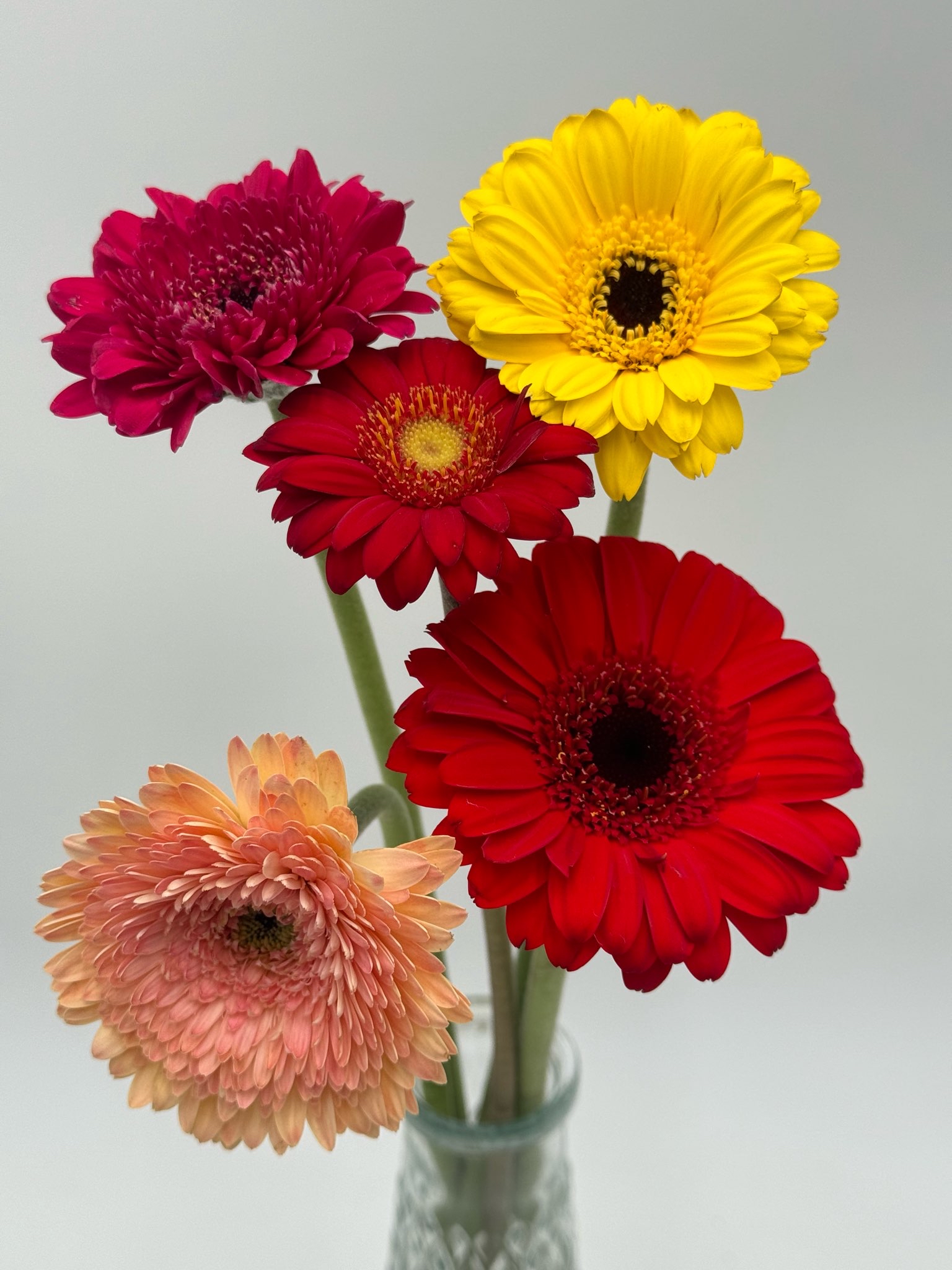 Gerbera and Mini Gerbera both bring that signature cheerful, open-faced bloom florists love just in different sizes. The standard Gerbera offers a bold, bright focal point with its large petals and vibrant colors, while the Mini Gerbera gives you the same playful look on a smaller, more delicate scale. Together, they blend beautifully, letting you mix strong statement blooms with smaller accents for depth and balance in your designs.